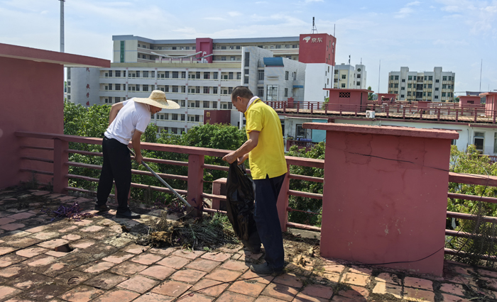 会后,是日上午全体教职工首先对自己所居住楼栋的楼梯和周边水沟、阳台花盆、杂物进行清扫和清除。下午全体教职工对学校公共区域卫生进行清扫和清洁。
