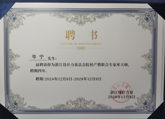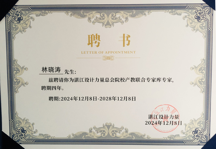 论坛大会上,岑宁副校长还被聘为“湛江设计力量总会院校产教联合专家库大师”,现代设计系主任林晓涛被聘为“湛江设计力量总会产教联合专家库专家”。
