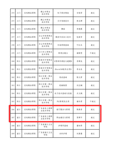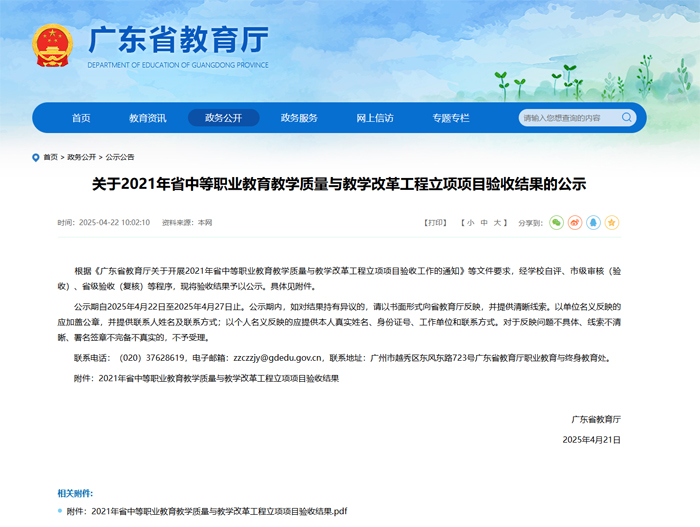 4月21日,广东省教育厅公示2021年广东省中职教育教学质量与教学改革工程立项项目验收结果。学校立项建设的“前厅服务与管理”“ 网站建设与管理”2项省级在线精品课程均顺利通过省级验收。
